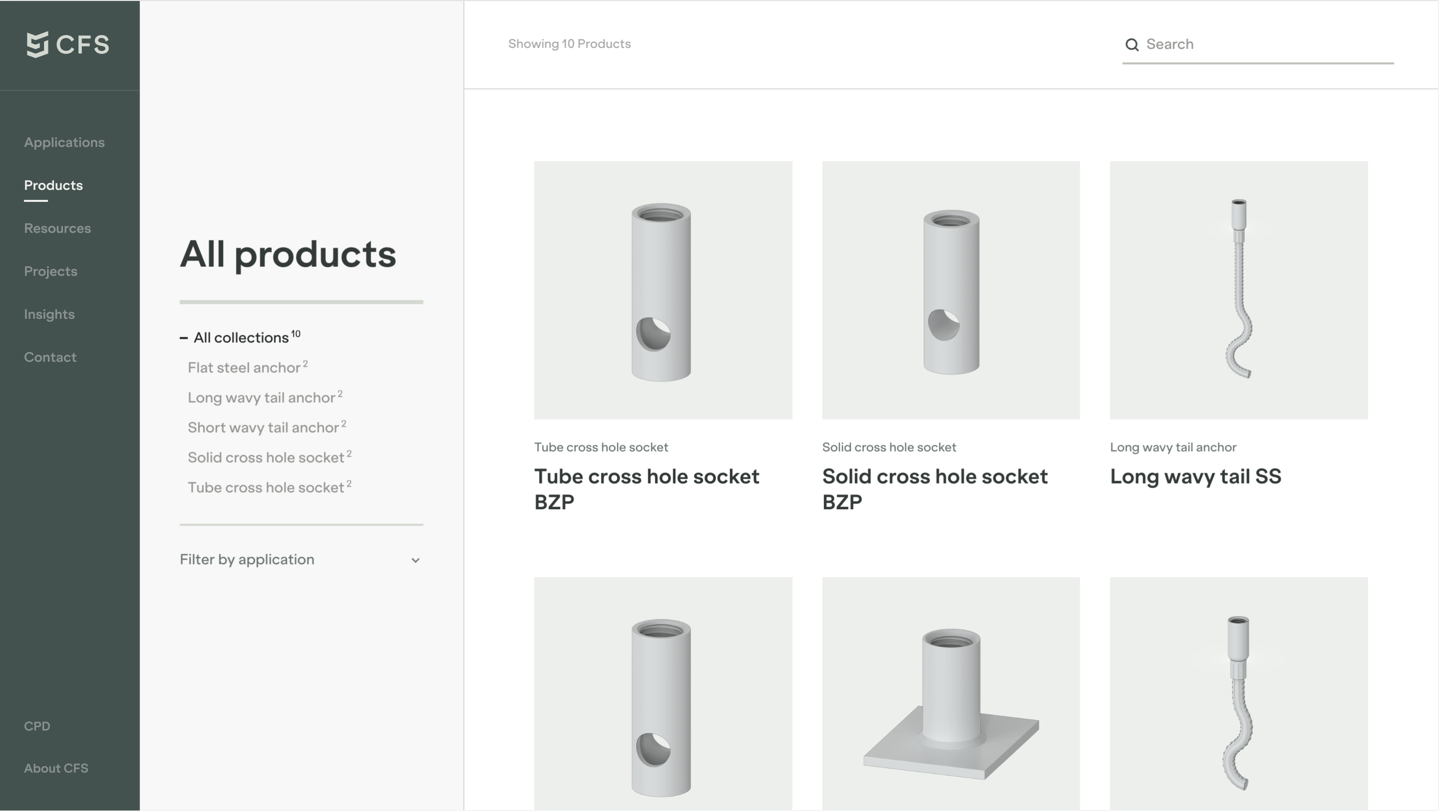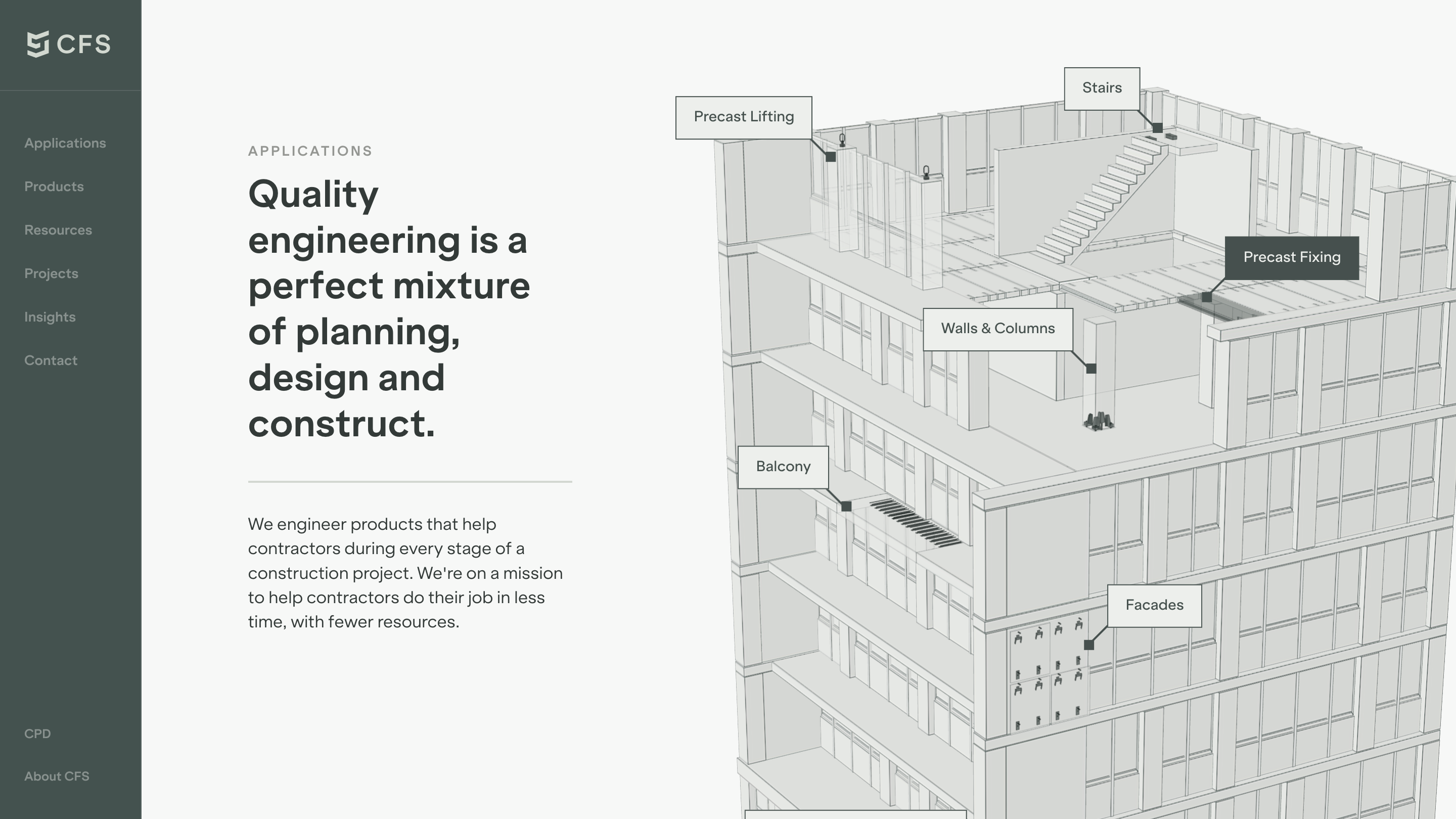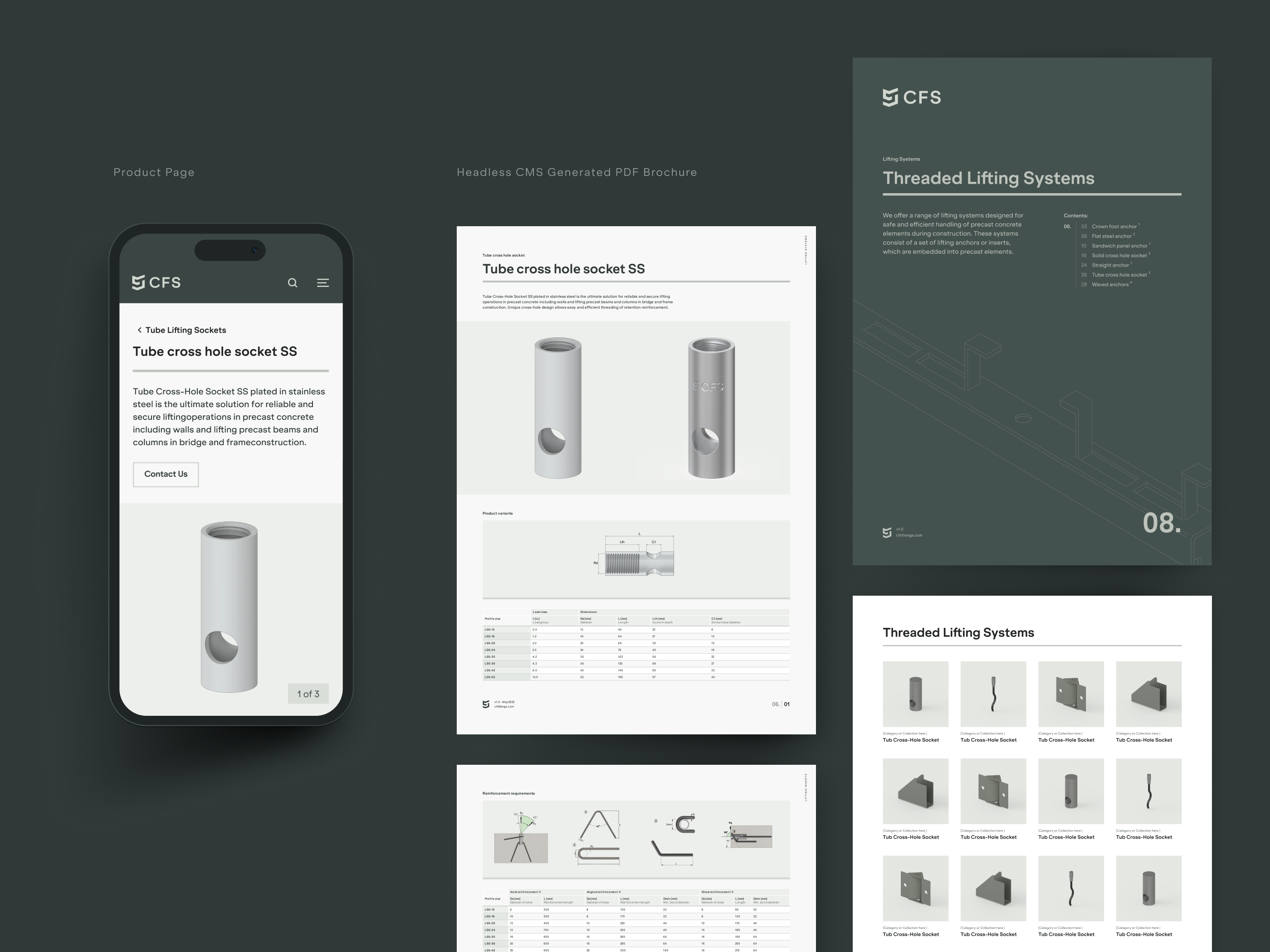 Using the design system created during the branding work, we designed a sleek modern site that utilises WebGL (including 3D in the browser). With UX / UI front of mind, we created a method within the CMS to display CFS' thousands of products with their specific features and attributes. We then used that CMS to dynamically create bespoke styled brochures for collections, products etc. for the wider team at the click of a button.