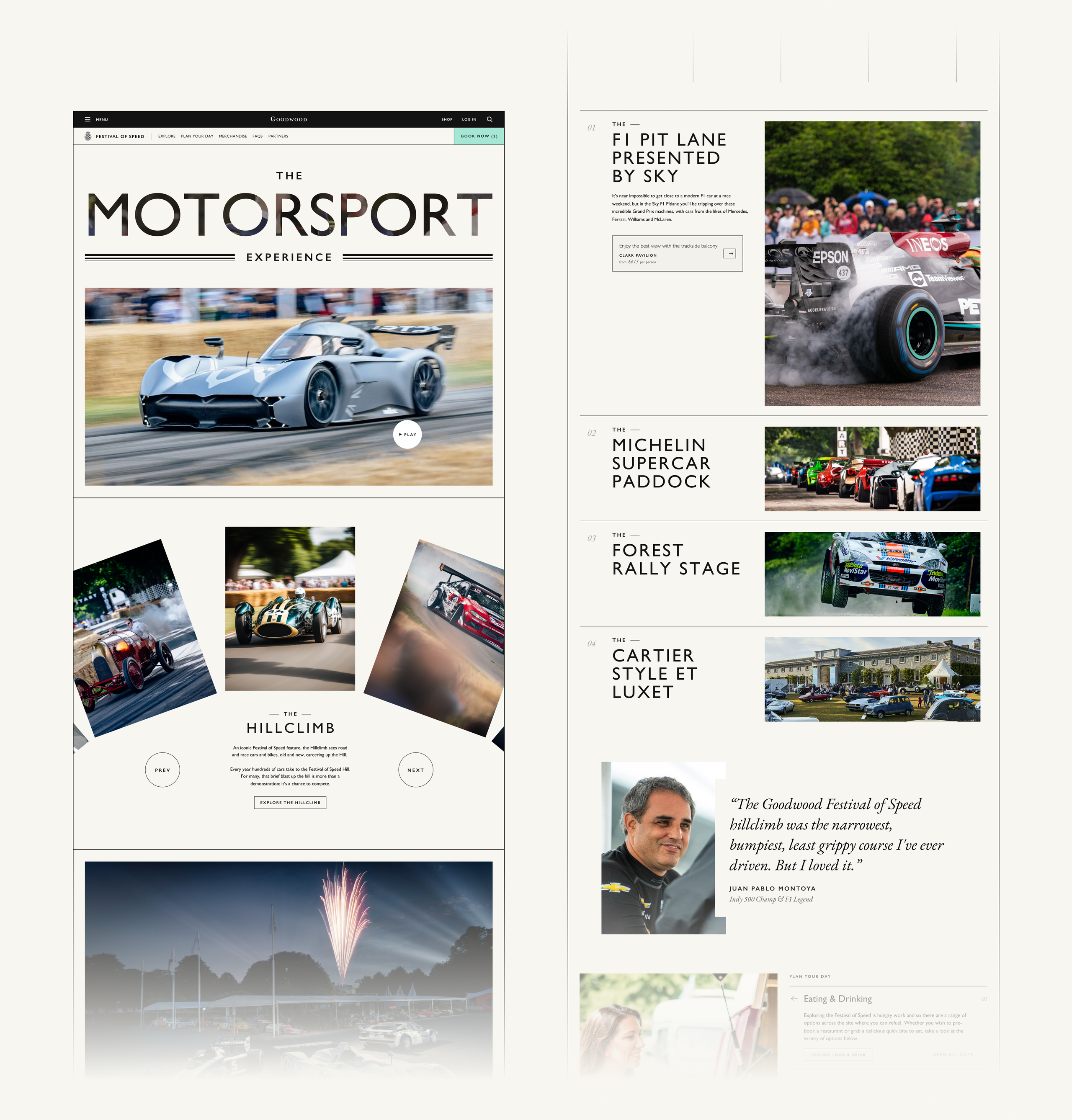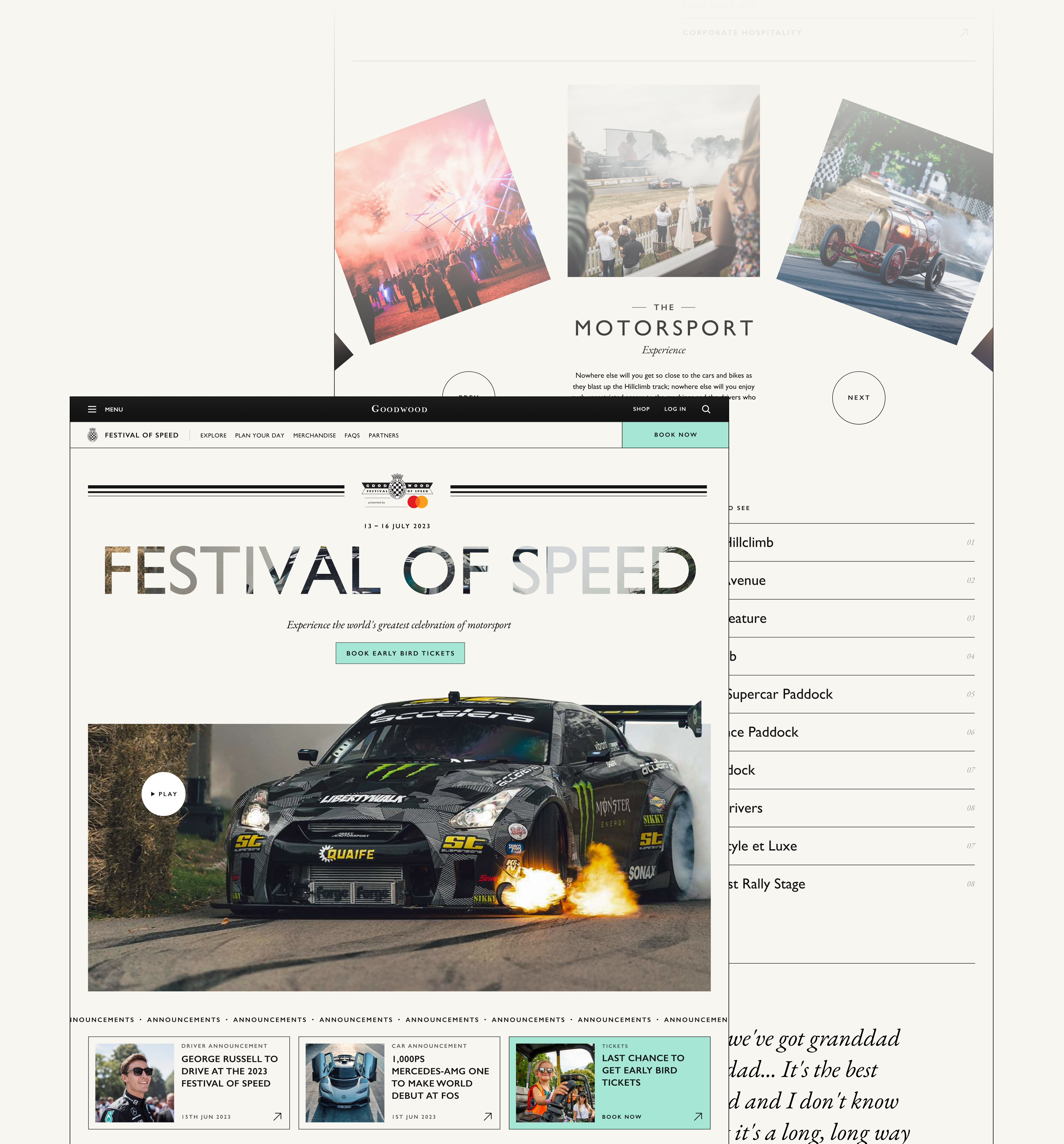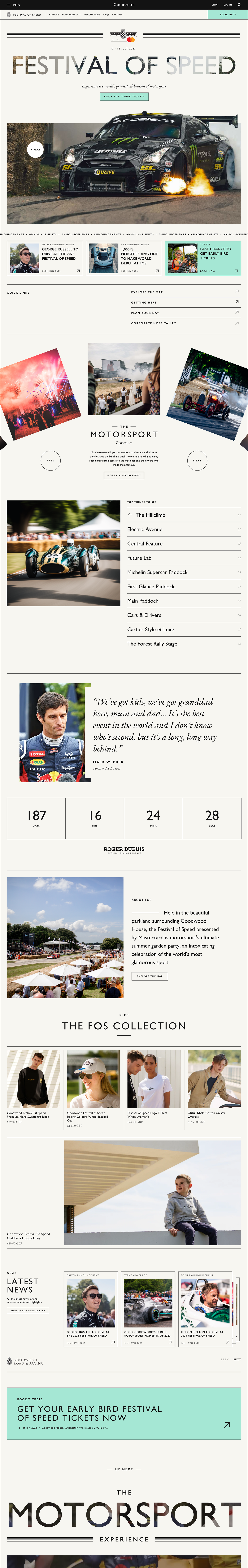 Goodwood have an established brand and well-known sub-brands, including Festival of Speed. Though they sell out for the event every year, their current site wasn't selling the event experience in an engaging way. The team were keen to see how they could bring the event to life during the announcement and peak sales period, as well as upsell additional packages to a range of audiences.
